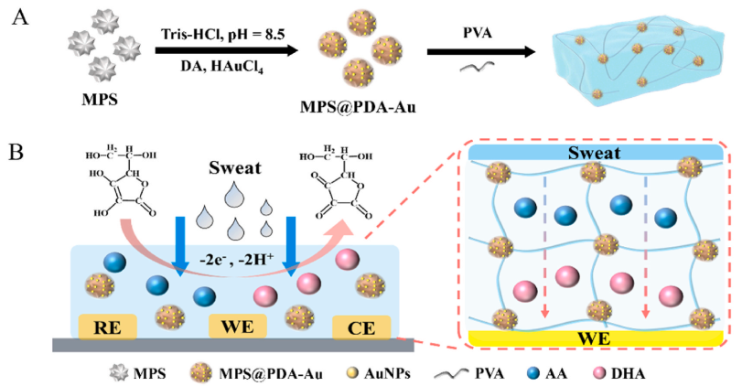 研究表明,基于贻贝启发化学合成了介孔二氧化硅@聚多巴胺-金(MPS@PDA-Au)纳米材料,并设计了一种自我修复的纳米复合水凝胶,用于监测人体运动和汗液中的抗坏血酸检测。将具有有序介孔结构的MPS与多巴胺(DA)在其表面聚合生成聚多巴胺(PDA),形成MPS@PDA-Au复合材料,并通过简单的冻融循环将其嵌入聚乙烯醇(PVA)水凝胶中,得到了具有良好变形能力的水凝胶(508.6%),自愈性(90.5%)和机械强度PVA/MPS@PDA-Au水凝胶传感器具有响应时间快的特点(123.2 ms),宽应变传感范围(0-500%),在人体检测中具有良好的抗疲劳性和稳定性,汗液中抗坏血酸(AA)的检测范围较宽该传感器的检测限低(3.3 μ mol/L),在人体运动监测和汗液成分检测方面具有良好的应用前景。