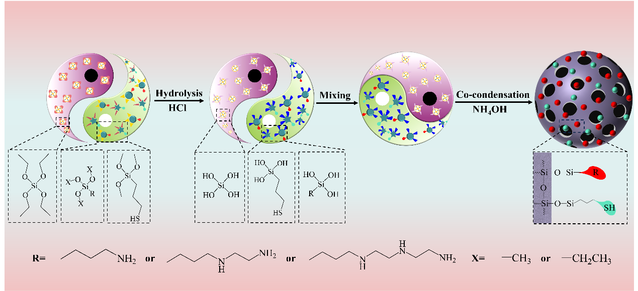 研究表明,通过溶胶-凝胶反应制备一系列孔结构和功能基含量可调的含氮、硫功能基的二氧化硅气凝胶,可实现水体中Hg(II)与孔雀石绿(MG)的高效吸附分离。合成的系列气凝胶对Hg(II)和MG均具有良好的吸附性能,最大吸附量分别为215.35和1227.14 mg·g−1,最佳吸附pH分别为6和10;吸附过程符合拟二级动力学模型和Langmuir等温吸附模型。在多种污染物共存及高盐环境下仍对Hg(II)与MG表现出显著吸附选择性且具有良好的循环再生使用性能,经过5次循环再生使用后,吸附Hg(Ⅱ)和MG后的再生率仍可保持在91.50%和90.23%。吸附机理研究表明,Hg(II)的吸附主要依赖与氨基、硫基的配位作用,而MG的吸附则主要依靠氢键形成。该研究制备了双功能基二氧化硅气凝胶,实现了重金属离子和染料的同时脱除,具有实际应用潜力。