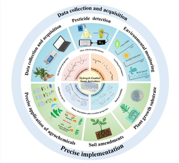 该综述阐述了水凝胶作为一种功能高分子材料,在推动智慧农业发展中的关键作用和巨大潜力,涵盖了从材料制备、关键性能到实际应用的各个方面。文章重点总结了水凝胶在数据采集(如植物生长监测、农药残留检测)、精准施肥与施药、土壤改良以及作物栽培基质等多种农业场景中的应用。通过对水凝胶的结构与功能的设计,可以实现其优异的机械性能、可控缓释能力、传感性能、粘附性、保水性和生物降解性,从而精准满足作物生长需求。值得注意的是,该综述分析了水凝胶在智慧农业应用中当前面临的挑战,并展望了其未来的发展方向,为构建可持续的智慧农业系统提供理论和应用见解。